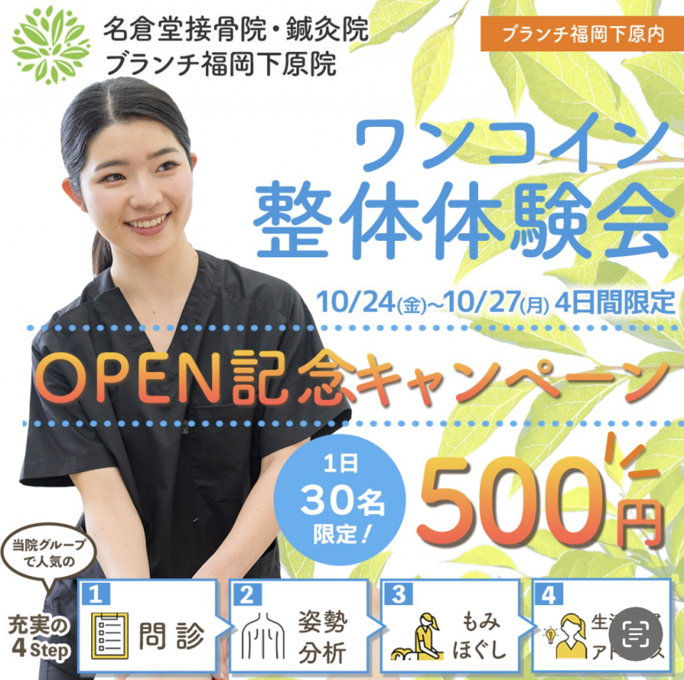 名倉堂鍼灸院・接骨院 ブランチ福岡下原院でございます。